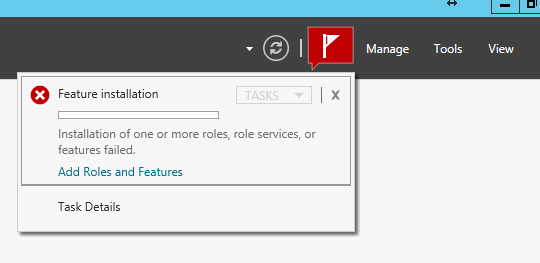 For example, after downloading the exe for the .Net Framework and forgetting that it is a feature of the windows server 2012, I remembered that I needed to install it via the manage link on the Server Manager, upper right. However, this didn’t work and I was presented with a lovely message about failure.